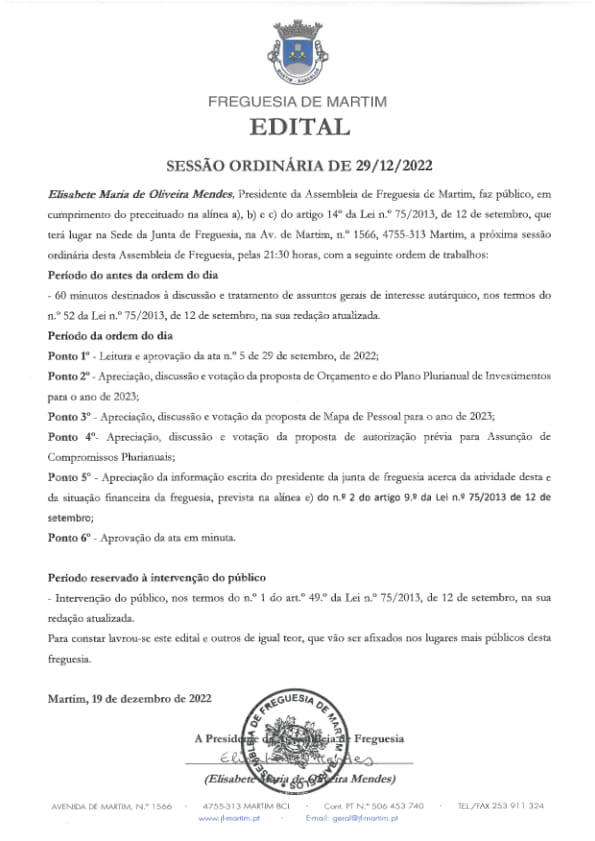 A sessão da Assembleia de Freguesia de Martim realiza-se no próximo dia 29 de dezembro (quinta-feira). A sessão decorrerá na sede de Junta de Freguesia de Martim, a partir das 21h30.