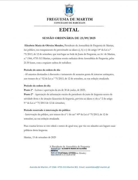 Ver maisA Sessão da Assembleia de Freguesia de Martim realiza-se na próxima quarta-feira, dia 23 de setembro.