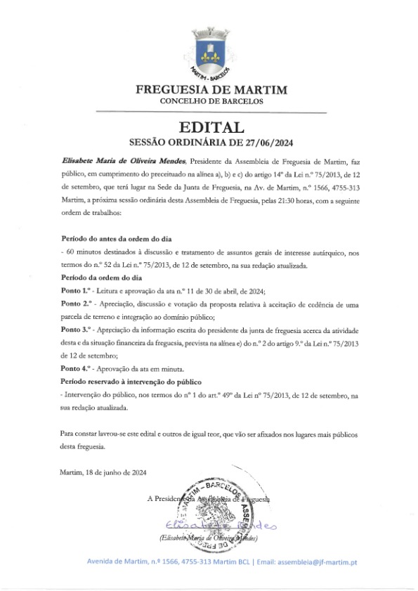 Realiza-se na próxima quinta-feira, dia 27 de junho, a Sessão da Assembleia de Freguesia de Martim.